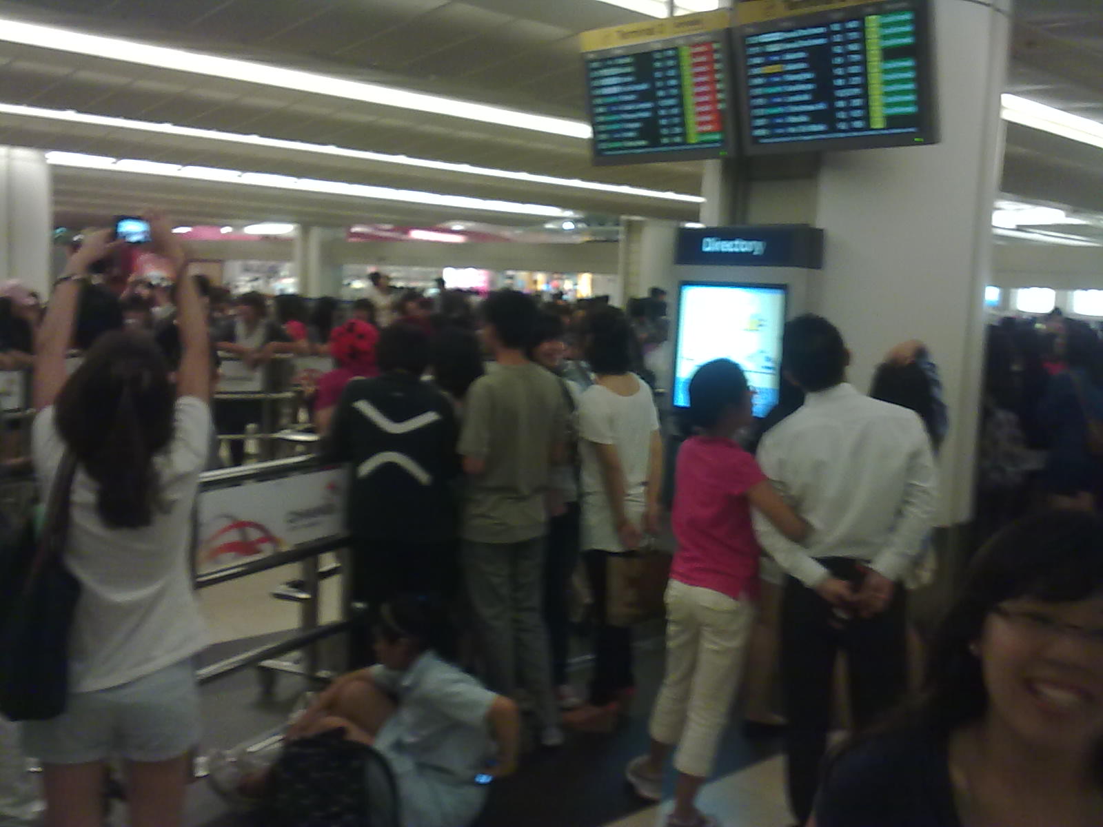 We arrived @ Suntec around 10:30 am but we had to buy some stuff for the Sukkie gift box and also a gift for Keun Sama as well. We were rushing ‘coz we know how early eels were planning to queue. We ran to the Rock Auditorium and saw the queue has already snaked to the stairs until 2nd floor emergency exit, I think. We found a spot, a ‘lil corner on the 2nd floor emergency exit. At 11:30, I received an sms from sears asking where we were. We were only a few mins. ahead of her. Even in that hot and humid place, we were still having so much fun and taking pics left and right. LOL! We can really survive anywhere! A lot of eels keep on coming and two security men keep on checking the queue, after awhile, they decided to let the eels after us to queue outside the door and into the mall. BUT @ around 1 pm, the queue became chaotic and everyone was running towards the entrance to the Rock Auditorium. Ayyayyay! We don’t know what happened :( Anyway, we were able to queue not that far from the entrance so it’s still okay.